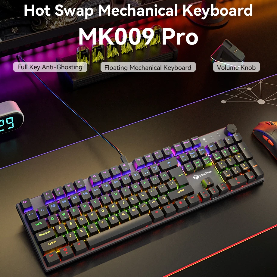 Bàn phím cơ gaming Meetion MK009 Fullsize 104 phím Hot-swappable (Red/Blue Switch), LED Rainbow, Panel kim loại, nút vặn âm lượng