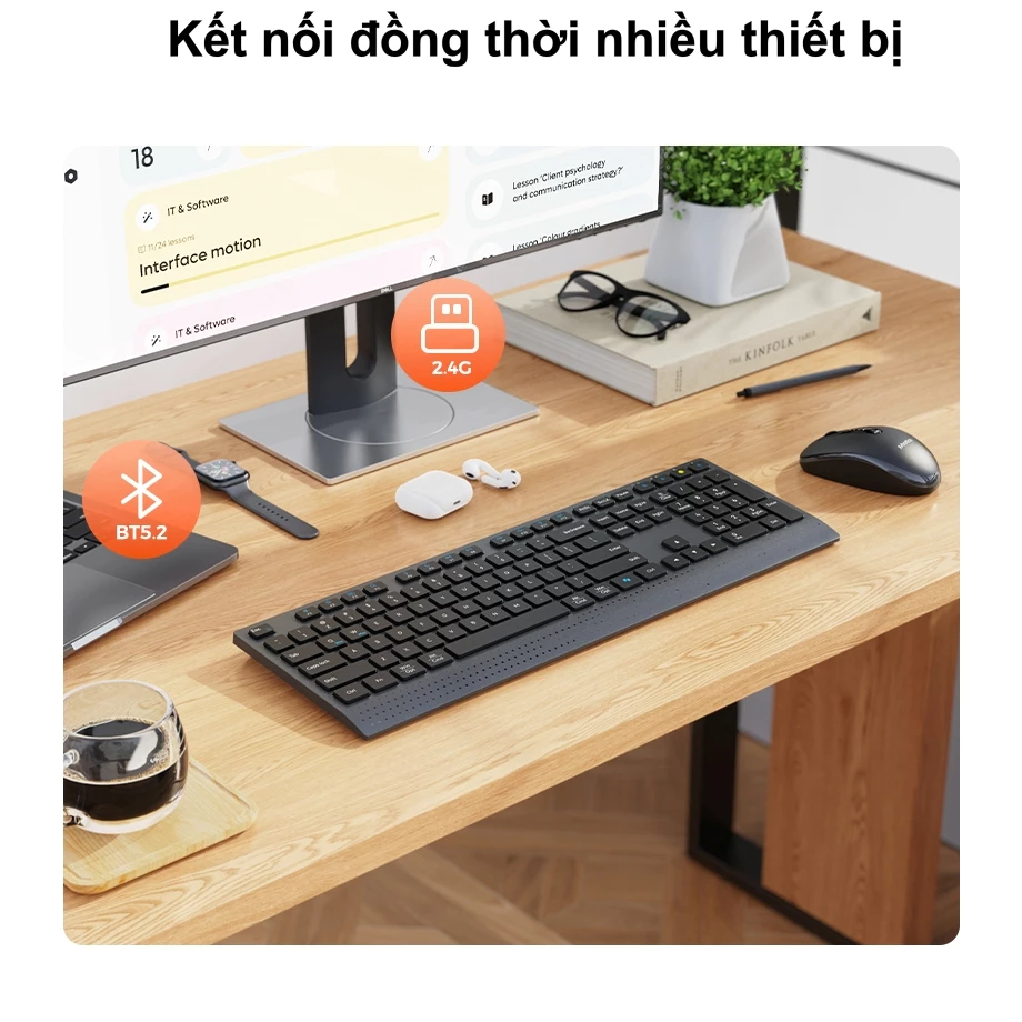 Bàn phím không dây văn phòng Meetion BTK2000 Dual Mode Bluetooth 5.2 & 2.4G, Fullsize 109 phím Silent, siêu mỏng 25mm, pin sạc 300H Type-C